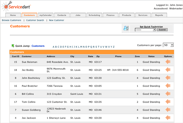 | Servicedart has a wide set of features for building and maintaining your customer database. You can easily import your customers from Outlook, Quickbooks or any other text file. The screenshot below shows what a typical customer record might look like. Each customer record supports multiple contacts & locations, a comment log, and an instant 'Service History' report to help you easily identify the current and past work for this customer. | |